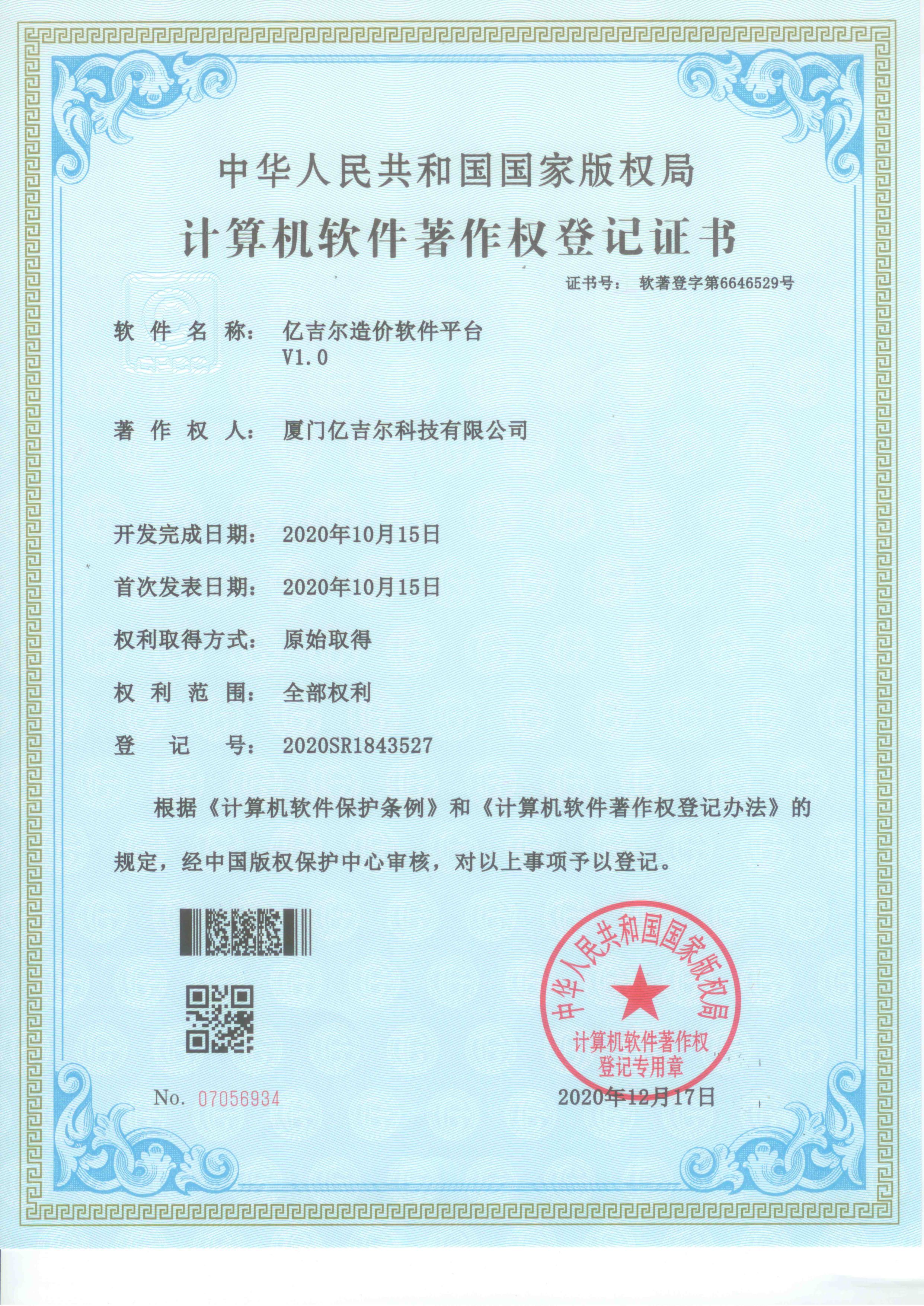 億吉爾造價(jià)軟件平臺(tái)著作權(quán)登記證書 發(fā)布日期:2023年11月22日 瀏覽次數(shù):1820 關(guān)鍵字: 公司 1/1億吉爾造價(jià)軟件平臺(tái)著作權(quán)登記證書