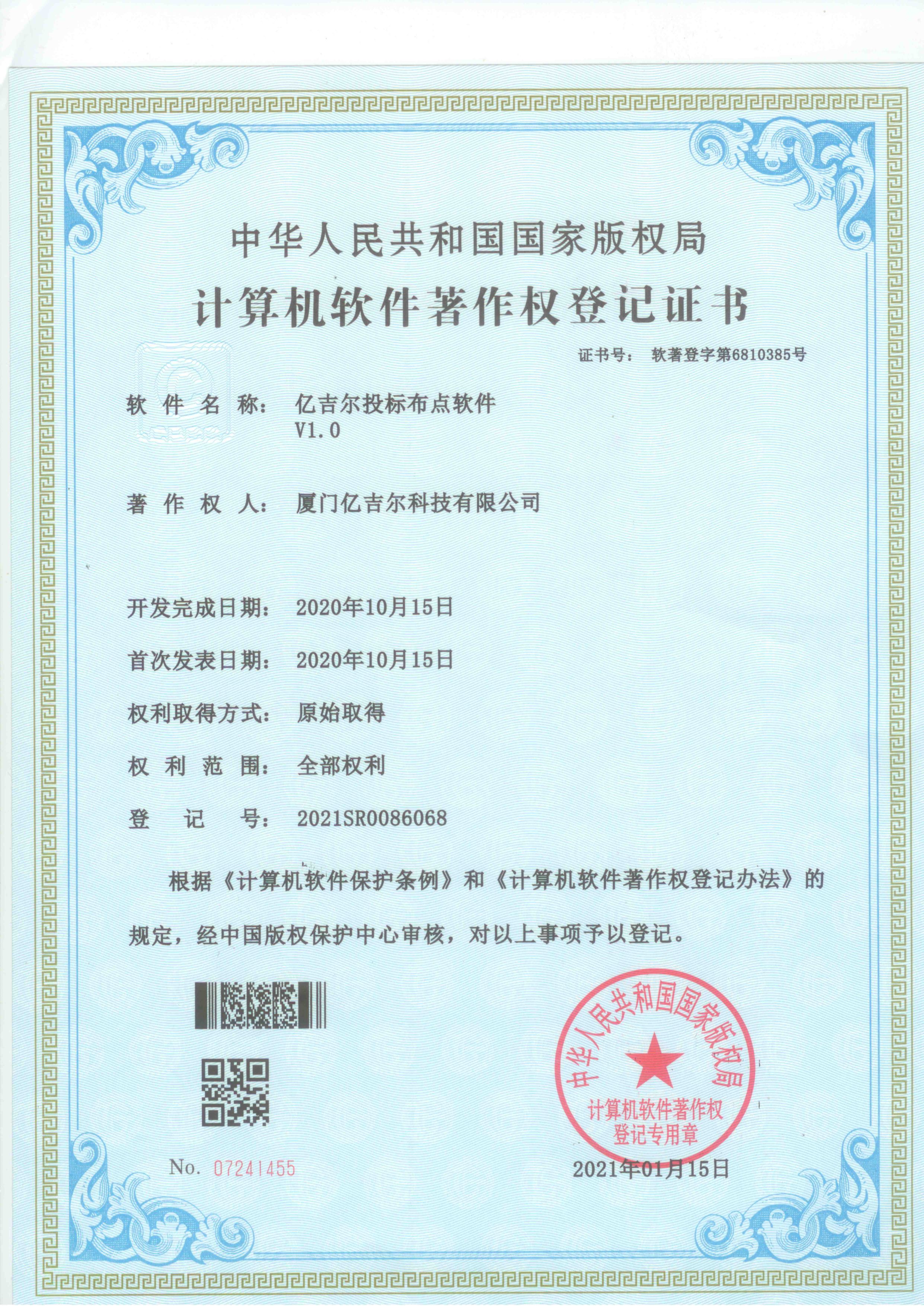億吉爾投標(biāo)布點(diǎn)軟件著作權(quán)證書 發(fā)布日期:2023年11月22日 瀏覽次數(shù):1764 關(guān)鍵字: 公司 1/1億吉爾投標(biāo)布點(diǎn)軟件著作權(quán)登記證書