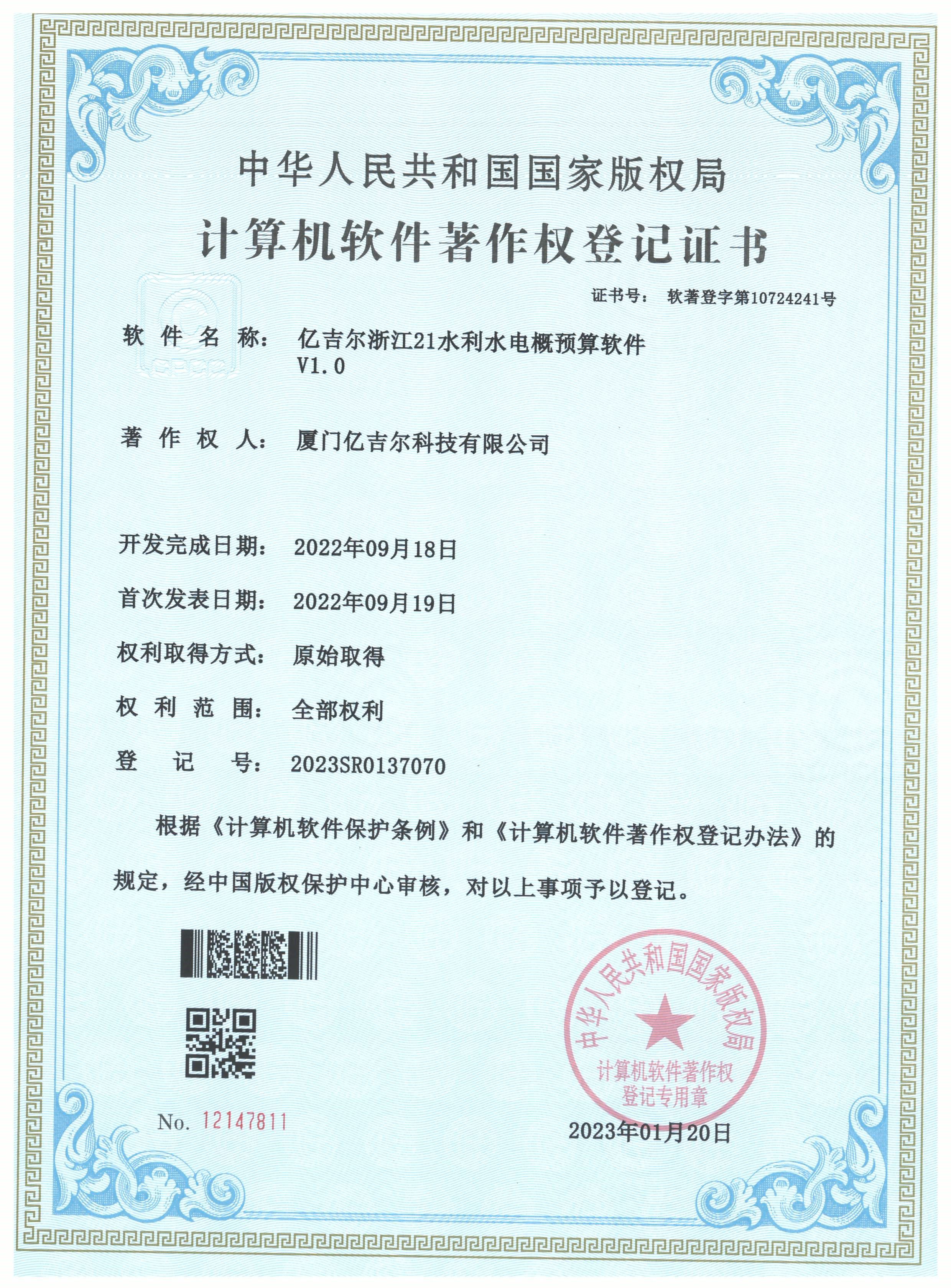 億吉爾浙江21水利水電概算軟件登記證書 發(fā)布日期:2023年11月22日 瀏覽次數(shù):1836 關(guān)鍵字: 公司 1/1億吉爾浙江21水利水電概算軟件登記證書(2022R11L1869444)