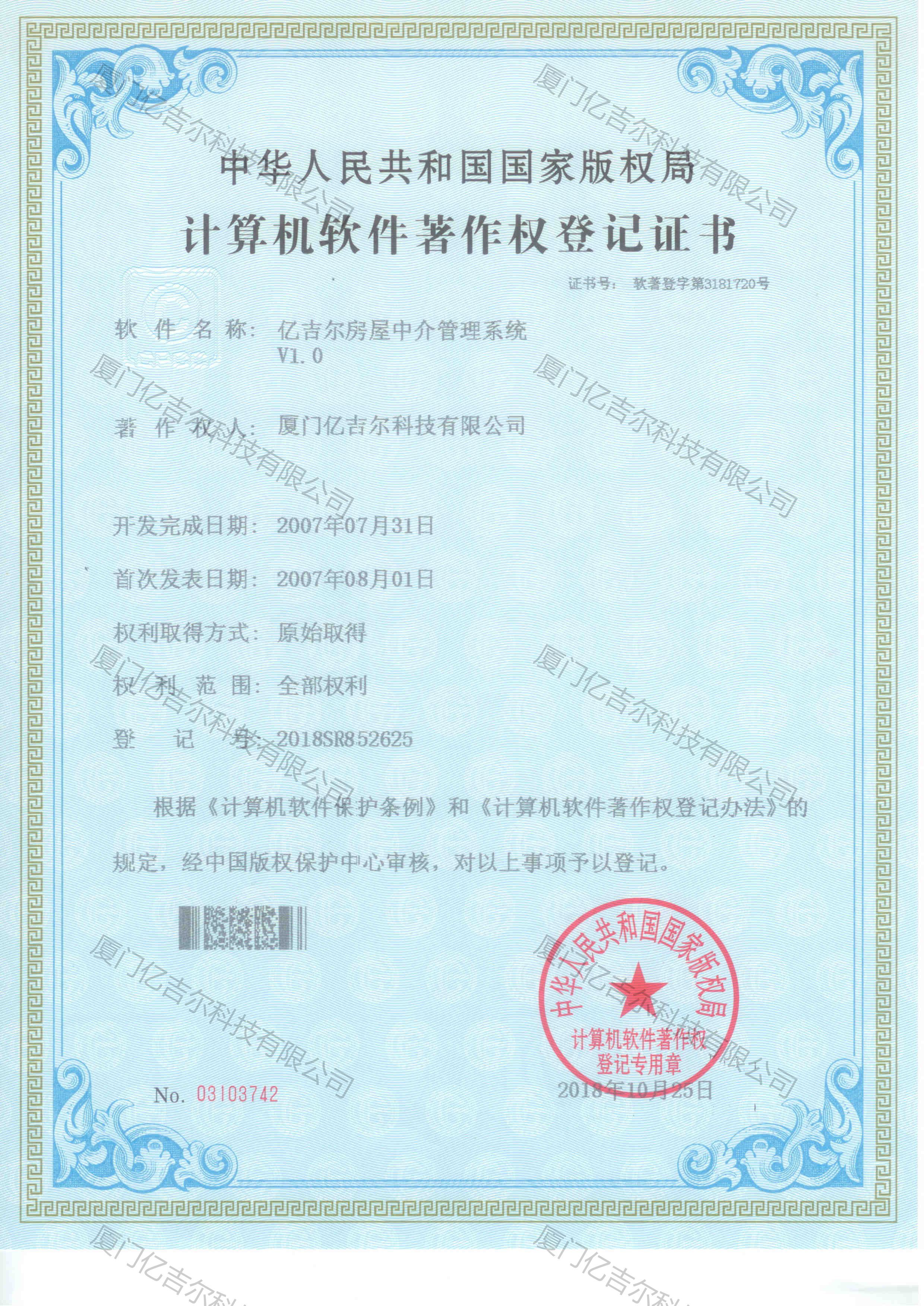 億吉爾房屋中介管理系統(tǒng)軟件著作權(quán)登記證書 發(fā)布日期:2018年10月25日 瀏覽次數(shù):3560 關(guān)鍵字: 公司 1/1億吉爾房屋中介管理系統(tǒng)軟件著作權(quán)登記證書