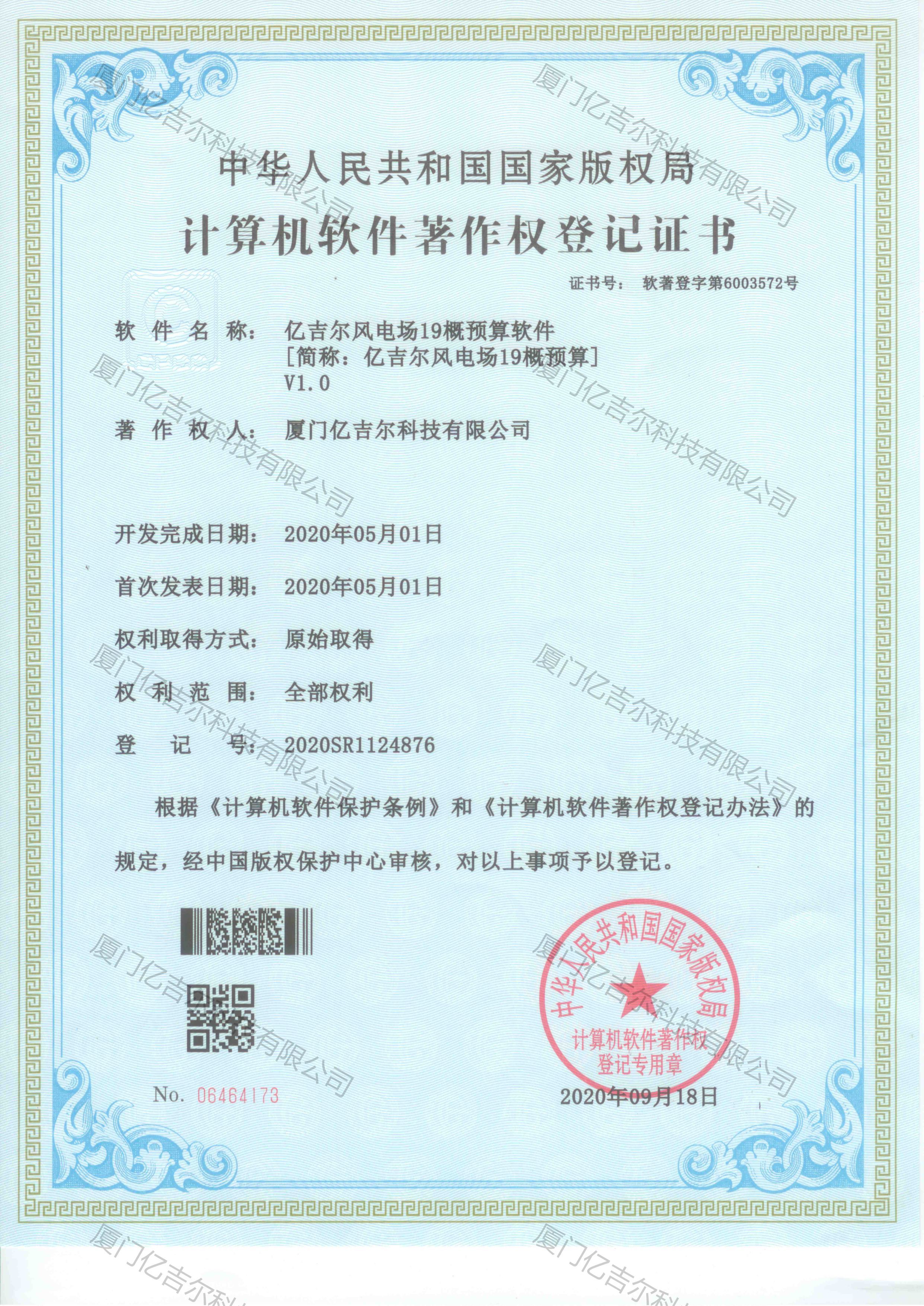 億吉爾風(fēng)電場(chǎng)19概預(yù)算軟件著作權(quán)登記證書(shū) 發(fā)布日期:2020年09月18日 瀏覽次數(shù):3567 關(guān)鍵字: 公司 1/1億吉爾風(fēng)電場(chǎng)19概預(yù)算軟件著作權(quán)登記證書(shū)