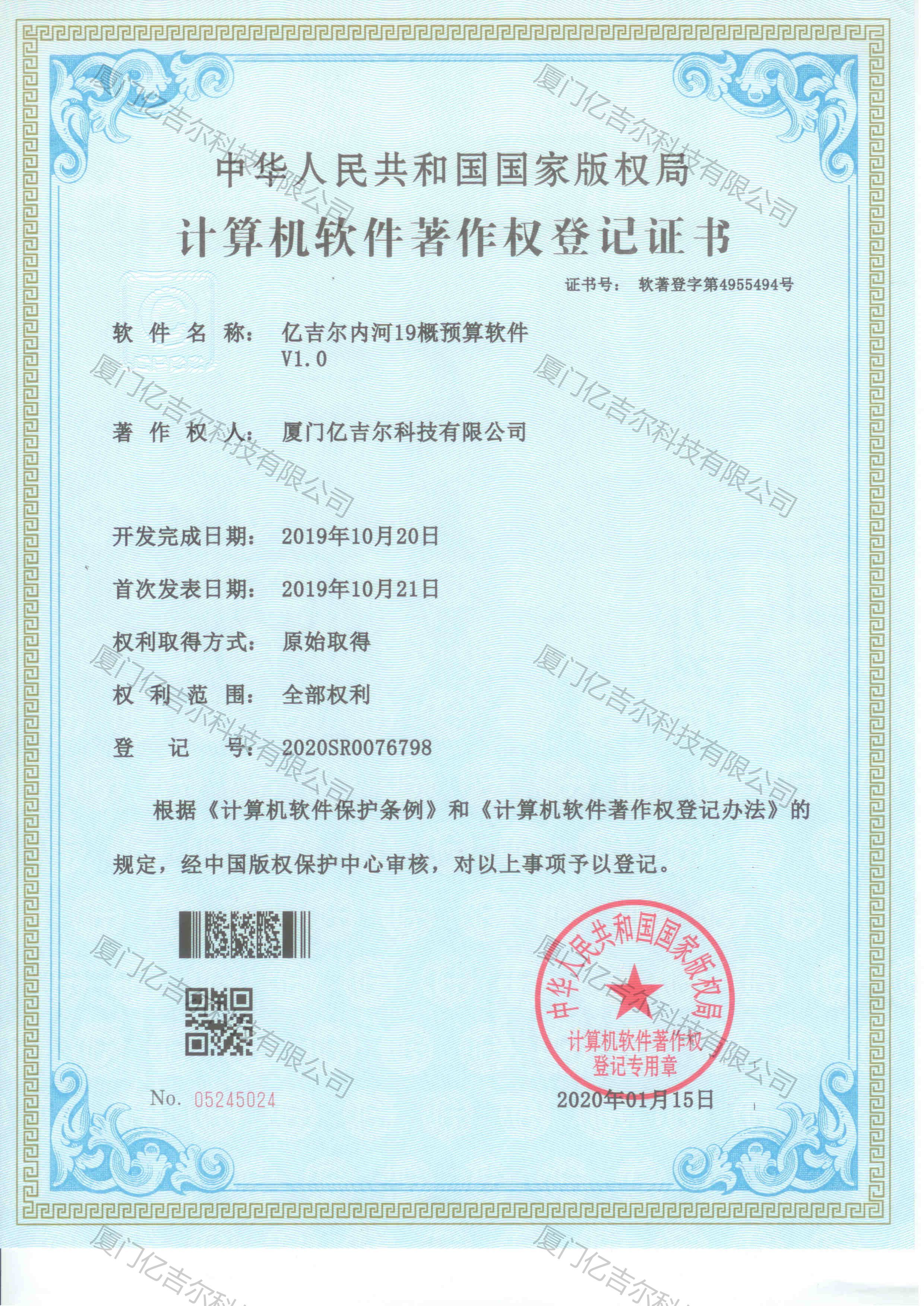 億吉爾內(nèi)河19概預(yù)算軟件著作權(quán)登記證書 發(fā)布日期:2020年01月15日 瀏覽次數(shù):3759 關(guān)鍵字: 公司 1/1億吉爾內(nèi)河19概預(yù)算軟件著作權(quán)登記證書