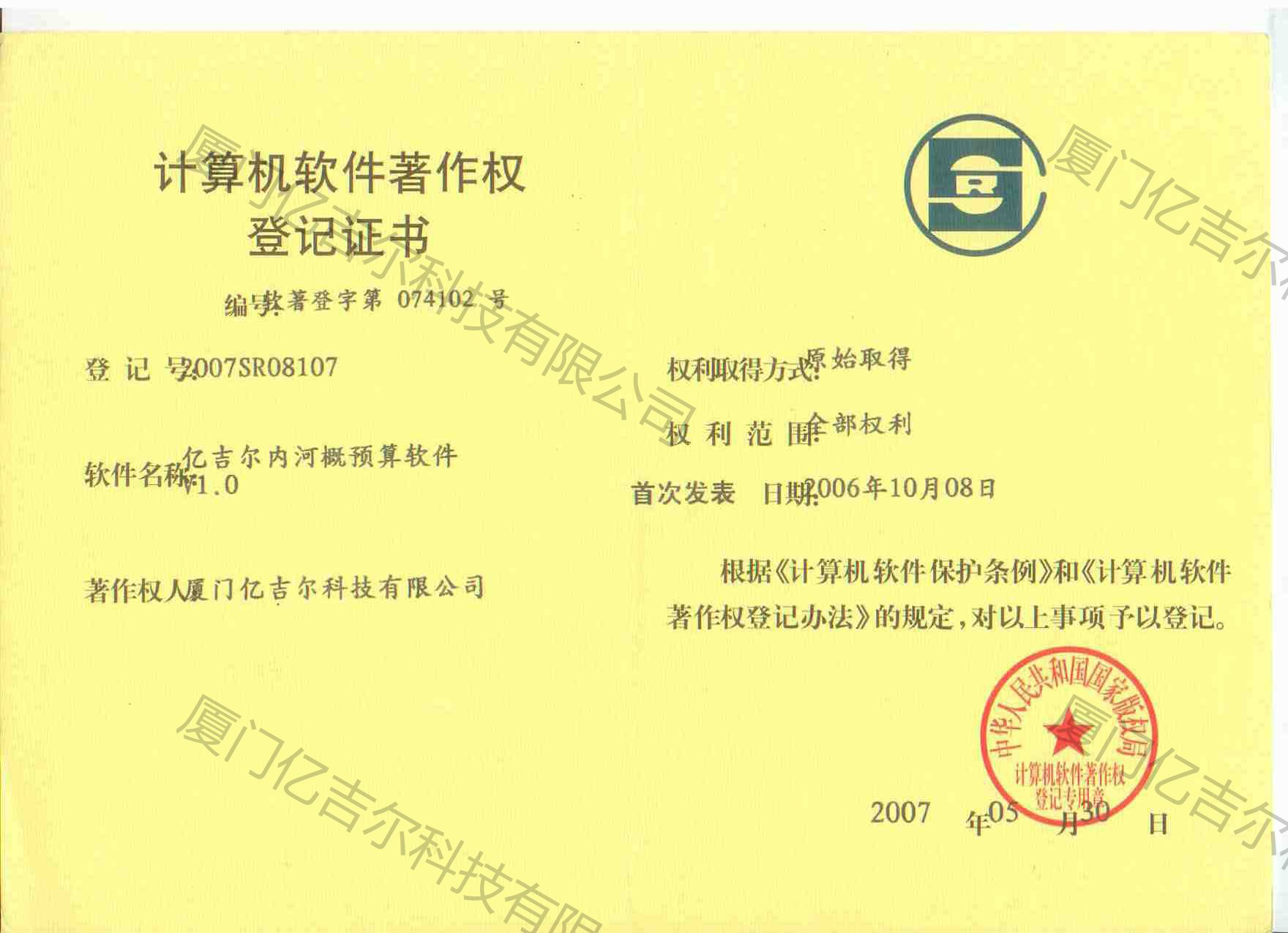 億吉爾內(nèi)河概預(yù)算軟件著作權(quán)登記證書 發(fā)布日期:2007年05月30日 瀏覽次數(shù):3146 關(guān)鍵字: 公司 1/1億吉爾內(nèi)河概預(yù)算軟件著作權(quán)登記證書