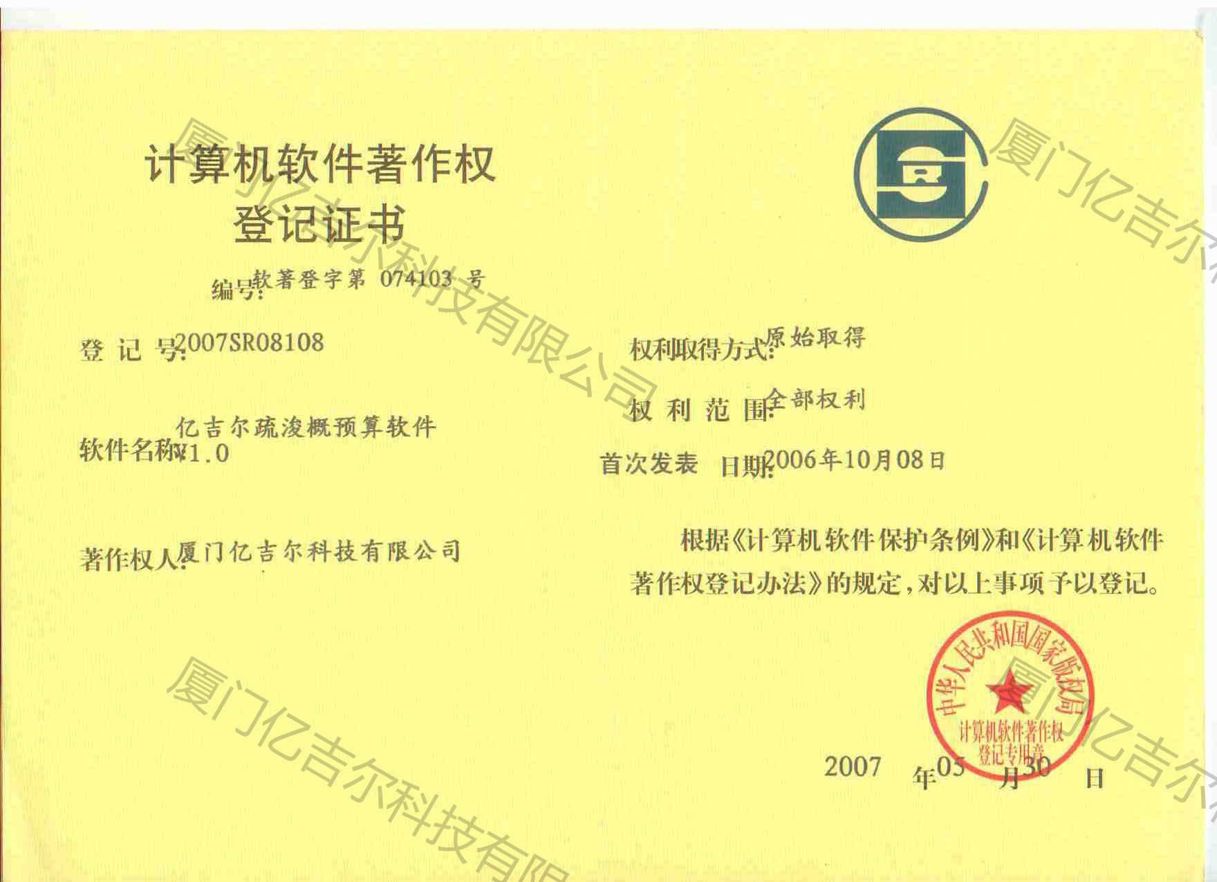 億吉爾疏浚概預(yù)算軟件著作權(quán)登記證書 發(fā)布日期:2007年05月30日 瀏覽次數(shù):3230 關(guān)鍵字: 公司 1/1億吉爾疏浚概預(yù)算軟件著作權(quán)登記證書