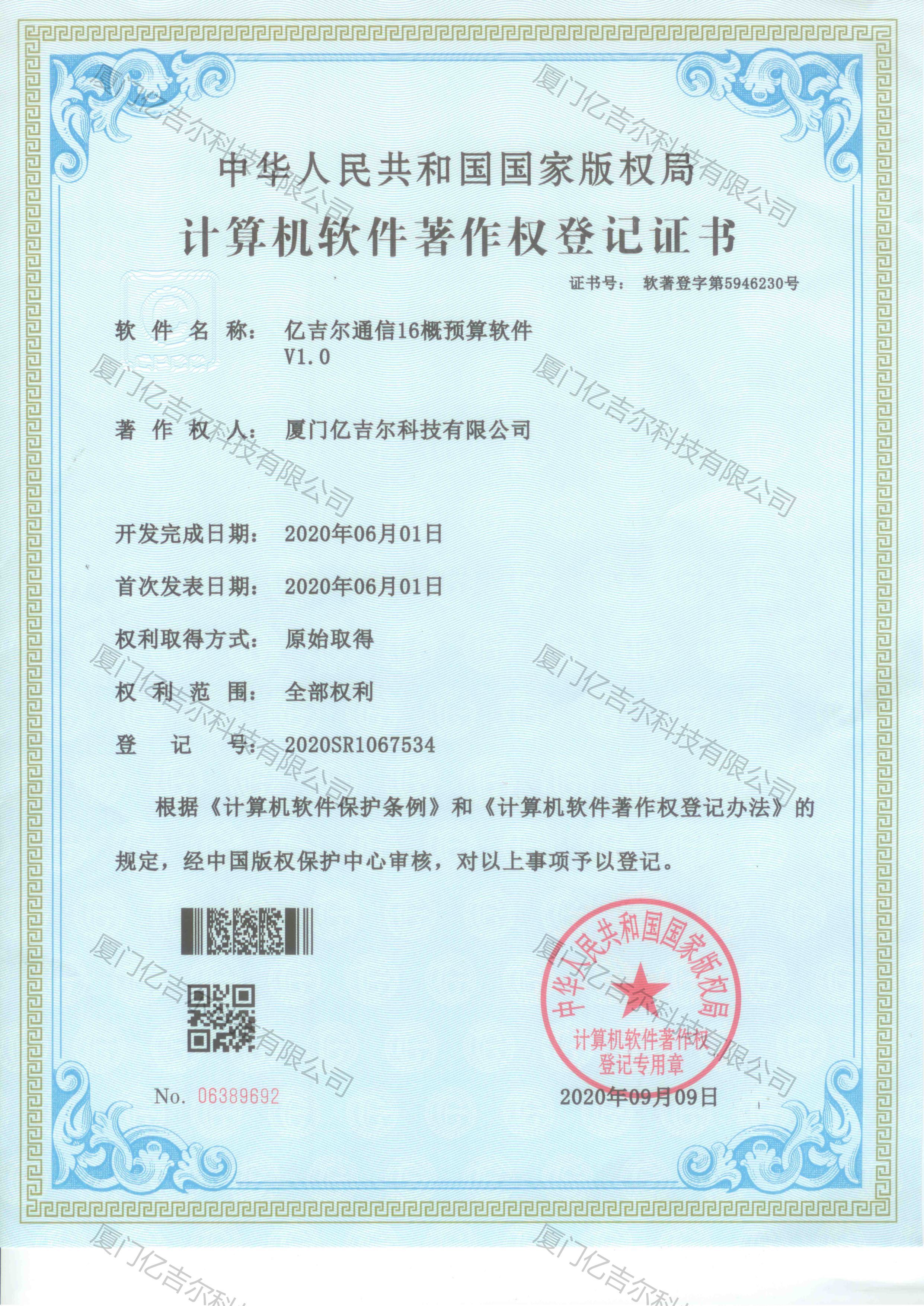 億吉爾通信16概預(yù)算軟件著作權(quán)登記證書 發(fā)布日期:2020年09月09日 瀏覽次數(shù):3662 關(guān)鍵字: 公司 1/1億吉爾通信16概預(yù)算軟件著作權(quán)登記證書