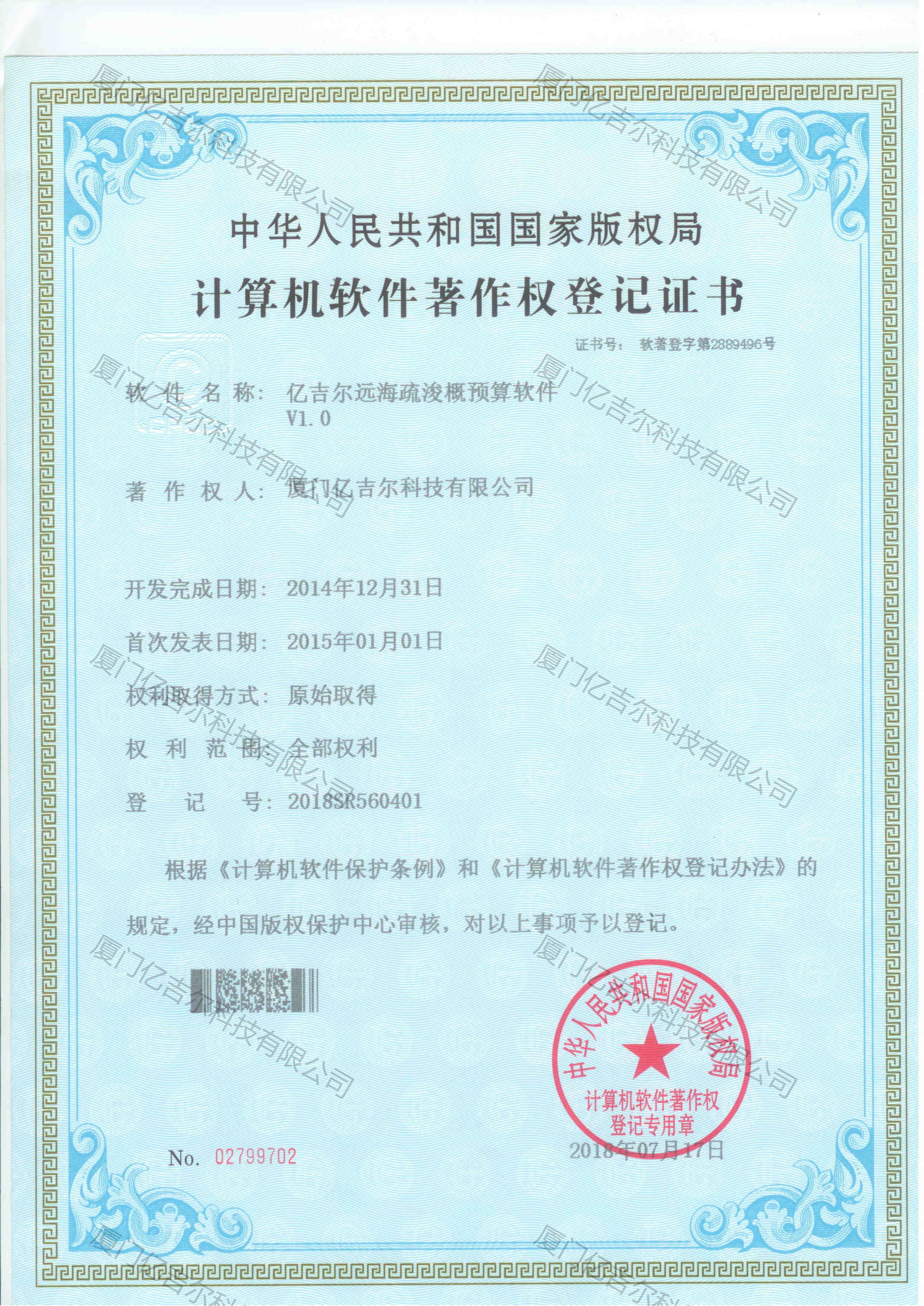 億吉爾遠海疏浚概預(yù)算軟件著作權(quán)登記證書 發(fā)布日期:2018年07月17日 瀏覽次數(shù):3268 關(guān)鍵字: 公司 1/1億吉爾遠海疏浚概預(yù)算軟件著作權(quán)登記證書