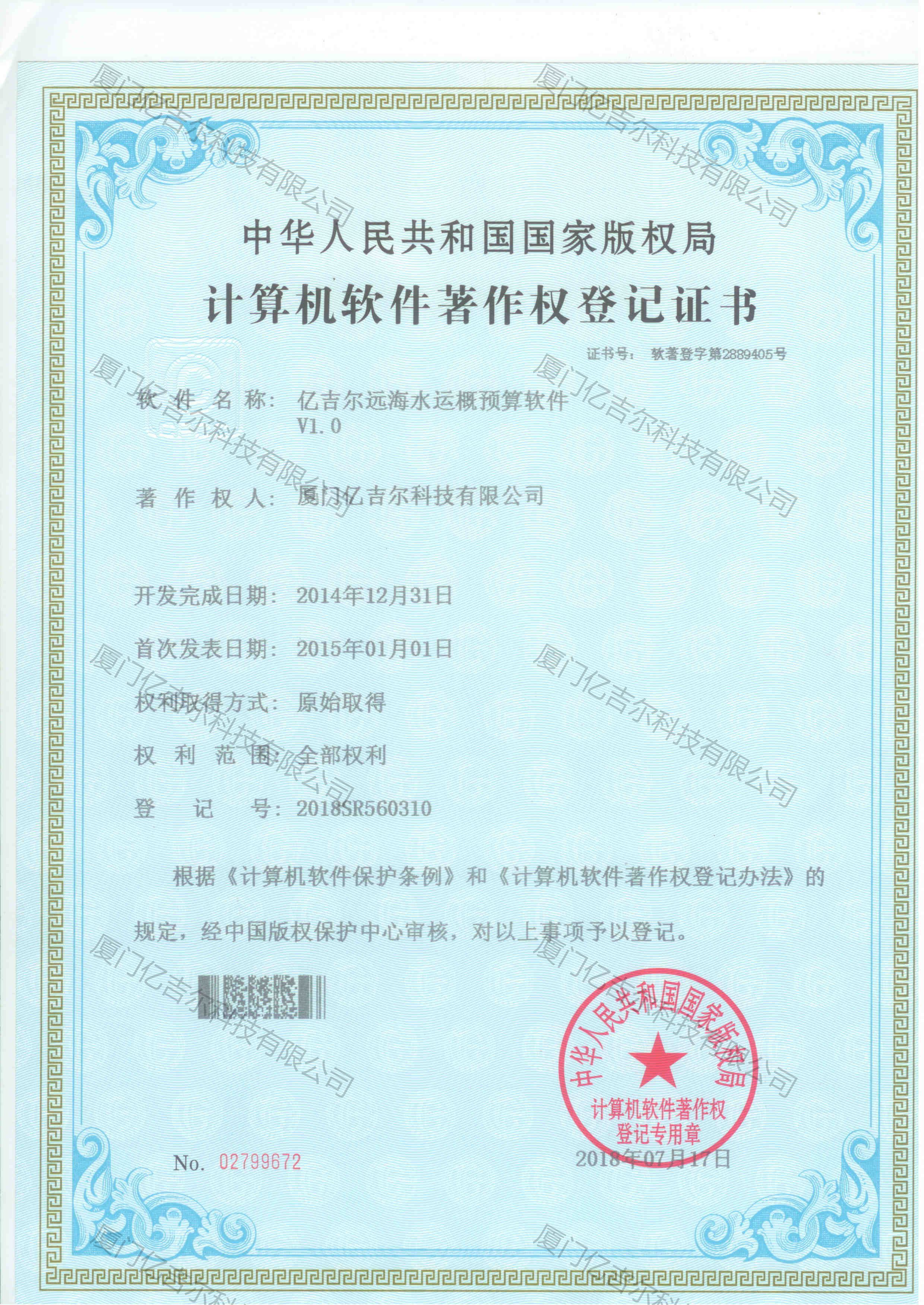 億吉爾遠(yuǎn)海水運(yùn)概預(yù)算軟件著作權(quán)登記證書 發(fā)布日期:2018年07月17日 瀏覽次數(shù):3354 關(guān)鍵字: 公司 1/1億吉爾遠(yuǎn)海水運(yùn)概預(yù)算軟件著作權(quán)登記證書